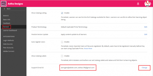 - Click on ‘General’ and scroll down to Support Email ID. These are the listed contact Email IDs for the Admin(s). To add/delete/edit, click on ‘Change’.