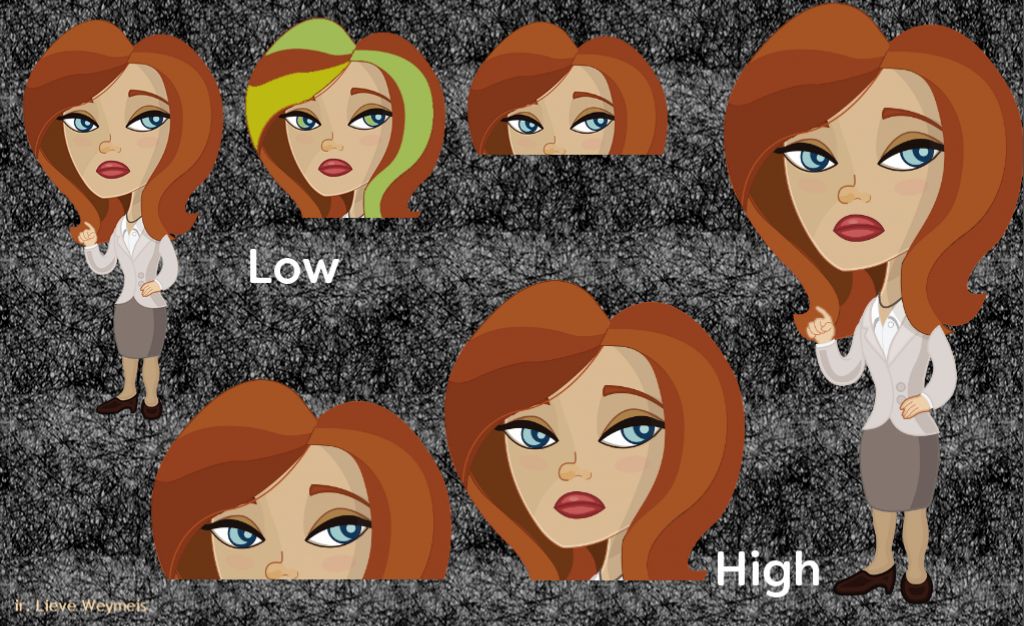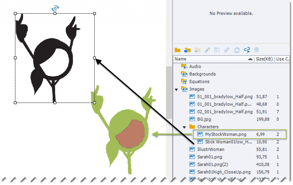 If I need multiple edited characters in a course, to be reused over and over again I would prefer to create a layered Photoshop file and use the Import functionality. You did see that I created an extra folder for Characters under the Images folder in the Library in the last screenshot. With an Imported PS file that would be unnecessary. Do not forget that it is always possible to use edited characters in the Library in any other project, by using the External Library workflow.
