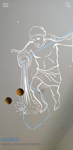 This app uses augmented reality to reveal objects in the sky, including planets, galaxies, constellations, and satellites. Just point your device at the sky or ground to see what is currently in that area of space. (I took the screenshot on the left to give you an example. I pointed my phone at the ceiling and discovered two planets and a constellation overhead.) You can also search for a specific object in the sky and have your device guide you to its location. And you can tap on an object to read general facts about it.