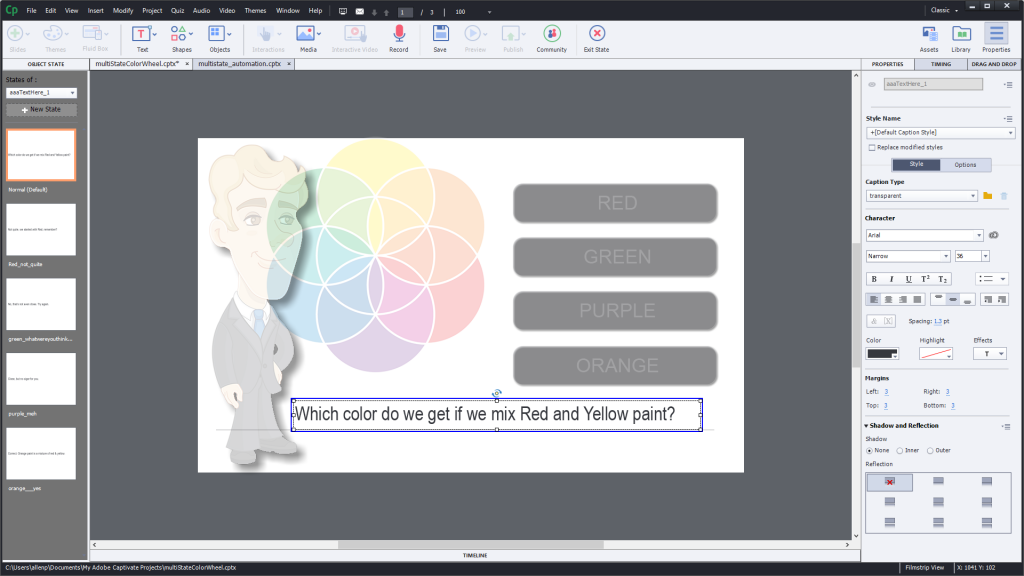 Now if this is your first use of a multi-state object, don’t worry. The concept is pretty simple. Most objects in your Adobe Captivate projects can be turned into multi-state objects. Buttons create their own multi-states in order to help with rollover effects and down states, but in this case I just added multiple states to an image (character) in order to make the process of changing the character’s ‘reaction’ to the answer selections simple.
