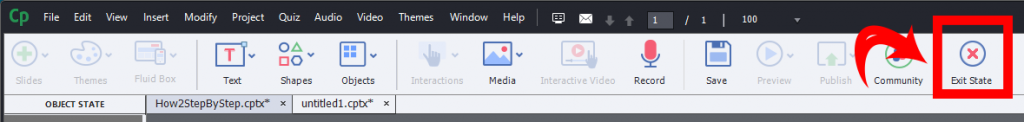 So all we have to do to change the expression on the character’s face, is to create a new state, name it, and replace the old image in that state with a new image – the one with the correct expression. I just deleted the old image, and pasted in the new one. It is however important to make sure that you have the right state (layer) selected while you edit the state. You can do that by selecting the state view button from the property inspector. Captivate will go all grey and you’ll see the slide thumbnails change into ‘state’ thumbnails. This is a special view, and you’ll have to use the special exit button on the top button bar. Don’t forget – click the big red X to exit the state view – or you’ll find yourself thinking that you can’t edit your project. Remember, I told you, big red X to exit the state view.