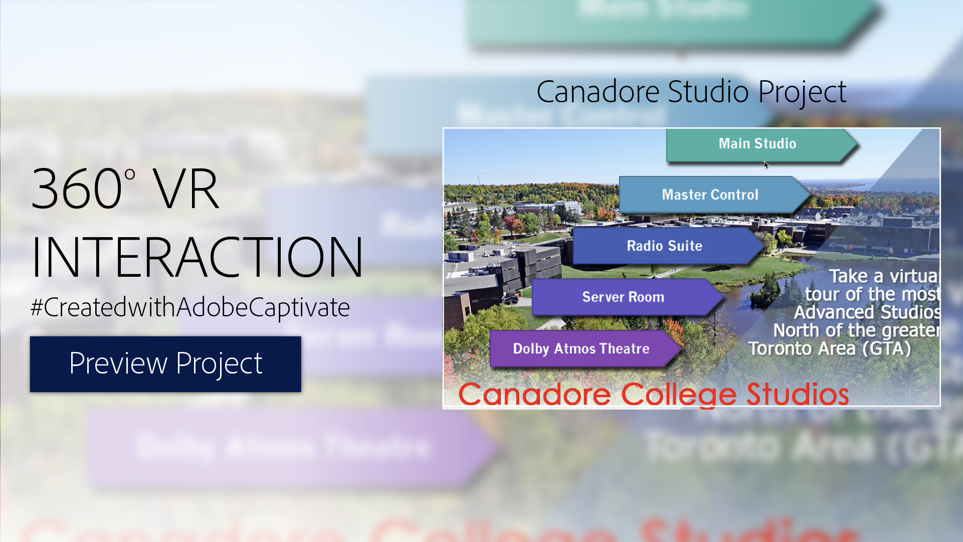 This is a normal Captivate project with a lot of VR 360 slides. One of the key points in here is the linking to the pages as you jump though the different studios.