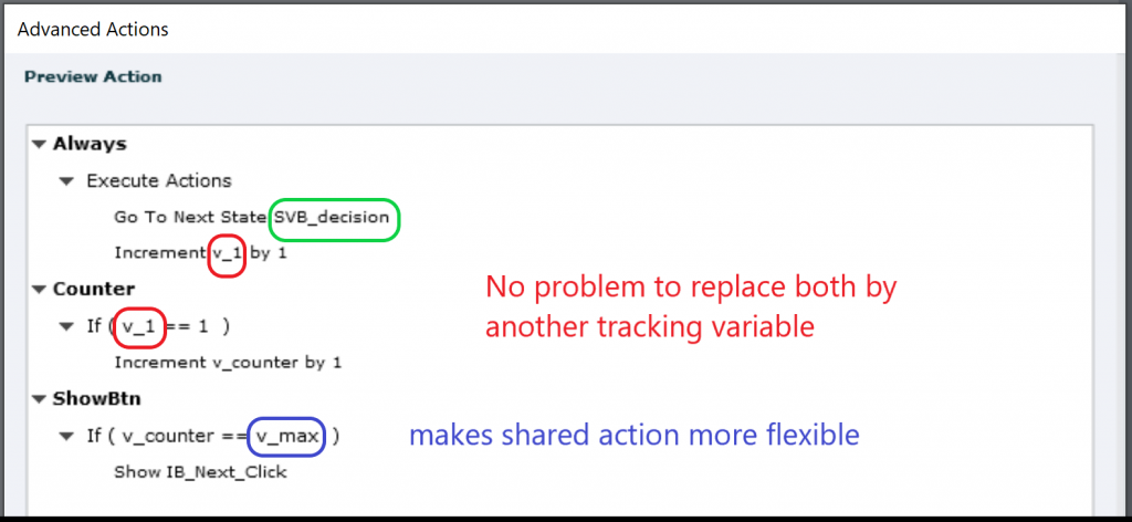 In this setup you cannot convert this action to a shared action. It would need 3 parameters: the Next button, the button itself and the tracking variable. But if you replace the first variable by the second variable, that will also happen in the second decision, thus leading to a non-functional second decision where only 3 variables are checked. Have a look at this action: