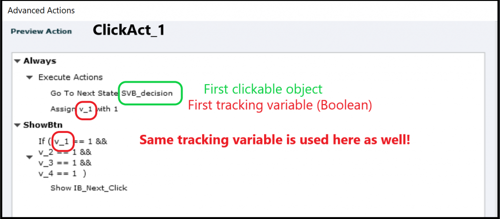 In this project, the first clickable object is SV_Decision. That object has a custom state showing Info, and acts as a toggle button. On a second click the Normal state will re-appear. Its tracking variable is v_1, a Boolean, which will get the value 1 on each click. On the slide 4 of those buttons need to be clicked. For the three other buttons both the name of the button and the tracking variable need to be edited in a duplicate advanced action. The second decision checks the 4 tracking variables, shows the Next button if all have the value 1.