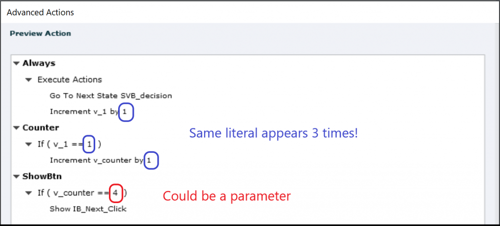 Be very careful with literals as parameters. My replacing it by a variable in the previous example gives you a possible workaround. Especially if you have multiple literals in an action, defining them as parameters can lead to issues. Look at this variant on the same situation described above: