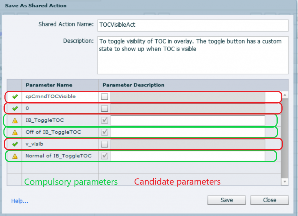 In this article I will focus on tips for choosing Parameters to make the shared actions as flexible as possible. When saving an action as Shared action, you get a dialog box where compulsory and candidate parameters will appear: