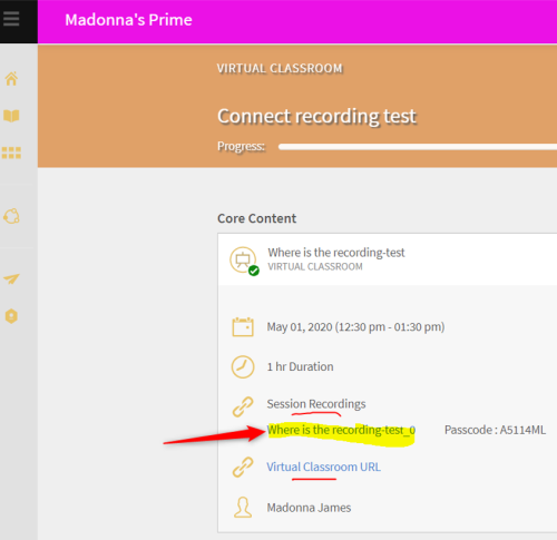 - The Adobe Connect recording link appears for the learner within the corresponding training a few minutes after the VILT session is complete.
