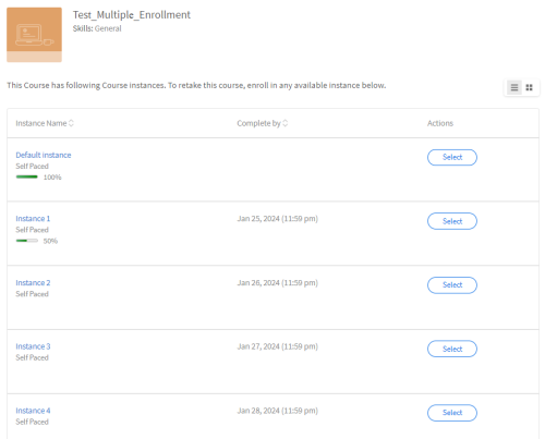As a learner, on the Learner app, select a course that has multiple instances, as shown below.