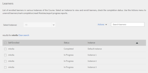 - Now, if you search a user for all instances they are enrolled in, search for the learners, and you can see all the different instances they’re enrolled in.