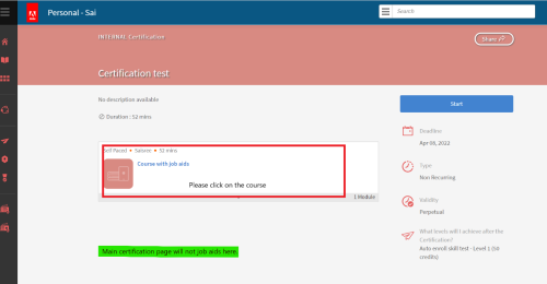 The job aids are visible when the learner clicks on the course. It will not be visible on the main page of the certification. Please find the below :