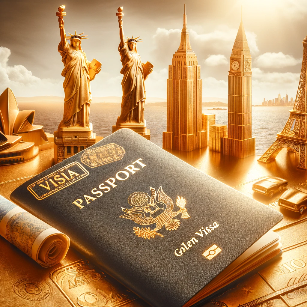 • DALL·E 2024-04-14 19.51.52 – A luxurious golden passport open to reveal visa stamps, set against a backdrop of famous global landmarks like the Eiffel Tower, the Statue of Liberty